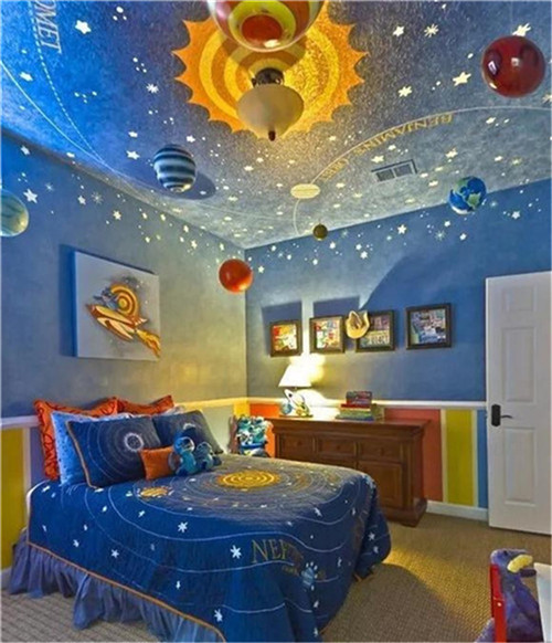 除了房间的颜色可以根据孩子的性格来定制,吊顶也可以根据孩子的活泼程度来设计,就像这个星空吊顶,躺在床上也充满了无限的艺术感,开发想象空间。