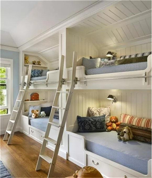 如果家有二胎或者多孩,不妨试试这样定制的上下铺,床铺靠墙设计,给足孩子满满的安全感,采光也足够,空间也最大化利用了。